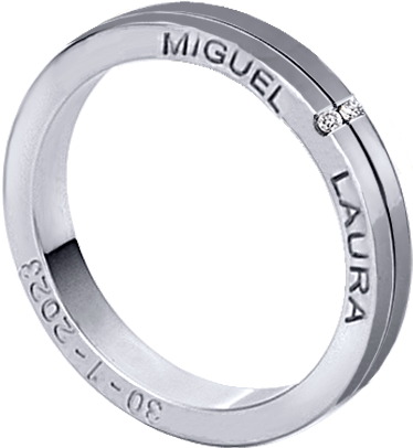 ALIANZA MATRIMONIO ORO BLANCO PULIDA Y MATIZADA CON GRABACION NOMBRES EN LATERAL ANILLO Y 2 DIAMANTES DE 0.015ct CADA UNO ENGARZADOS EN CANAL