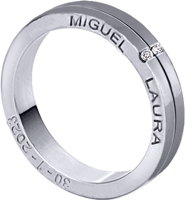 ALIANZA MATRIMONIO ORO BLANCO PULIDA Y MATIZADA CON GRABACION NOMBRES EN LATERAL ANILLO Y 2 DIAMANTES DE 0.02ct CADA UNO ENGASTADOS EN CANAL