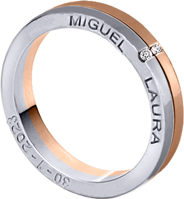 ALIANZA MATRIMONIO ORO BICOLOR PULIDA Y MATIZADA CON GRABACION NOMBRES EN LATERAL ANILLO Y 2 DIAMANTES DE 0.02ct CADA UNO ENGASTADOS EN CANAL