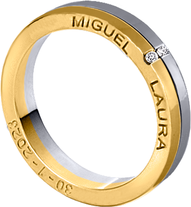 ALIANZA MATRIMONIO ORO BICOLOR PULIDA Y MATIZADA CON GRABACION NOMBRES EN LATERAL ANILLO Y 2 DIAMANTES DE 0.02ct CADA UNO ENGASTADOS EN CANAL