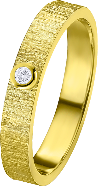 ALIANZA DE BODA EN ORO AMARILLO DE 18KT PERFIL PLANO DE 3.5m DE ANCHO Y 1.3m DE GROSOR CON TEXTURA MATE Y UN DIAMANTE DE 0.02ct ENGARZADO EN ARO SUPERPUESTO