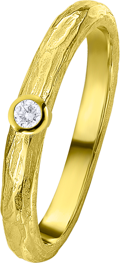 ALIANZA DE BODA EN ORO AMARILLO DE 18KT PERFIL SEMI REDONDO DE 2.8m DE ANCHO Y 1.8m DE GROSOR CON TEXTURA SEMI PULIDA Y UN DIAMANTE DE 0.03ct ENGARZADO EN CHATON INCRUSTADO EN EL ARO