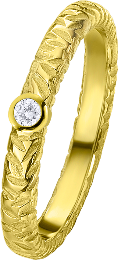 ALIANZA DE BODA EN ORO AMARILLO DE 18KT PERFIL SEMI REDONDO DE 2.8m DE ANCHO Y 1.8m DE GROSOR CON TEXTURA SEMI PULIDA Y UN DIAMANTE DE 0.03ct ENGARZADO EN CHATON INCRUSTADO EN EL ARO